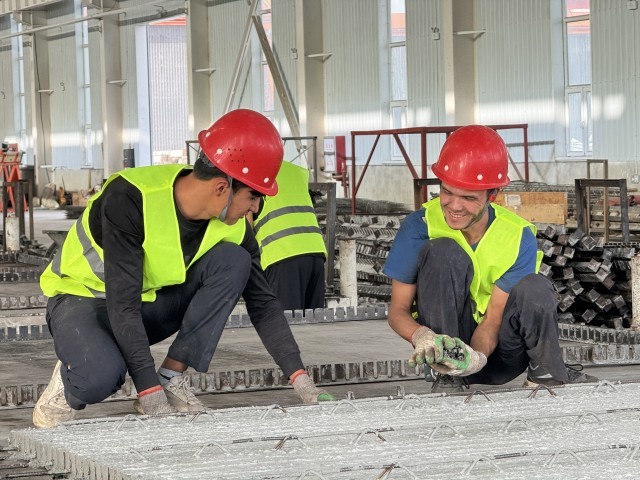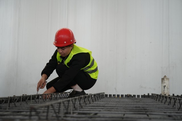 9月21日,新疆北方科技发展有限公司钢构车间内=◁▲,喀什地区疏勒县洋大曼乡25岁的努尔阿米乃姆·阿卜力米提正在熟练地绑钢筋,去年7月她的丈夫来到公司工作△,包吃包住和工资待遇让她心动,今年5月,努尔阿米乃姆·阿卜力米提和丈夫成为工厂的一对夫妻工。中青报·中青网记者 王雪迎/摄