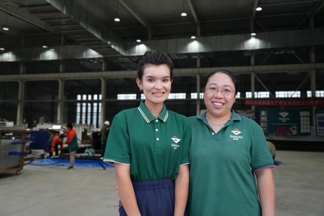 9月21日,新疆喀什欣海新材料科技有限公司生产车间里□,员工依米尼古丽·依马木艾山和牛丽欣并肩微笑,工作和日常相处让她们成为了朋友。中青报·中青网记者 王雪迎/摄